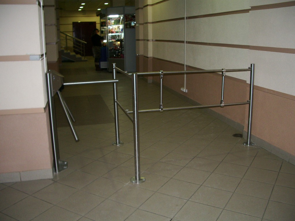 | Зеленков переулок д. 2. Проходная. Турникет-трипод фирмы ОМА с ограждением. Нержавеющая сталь. |