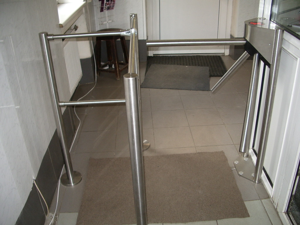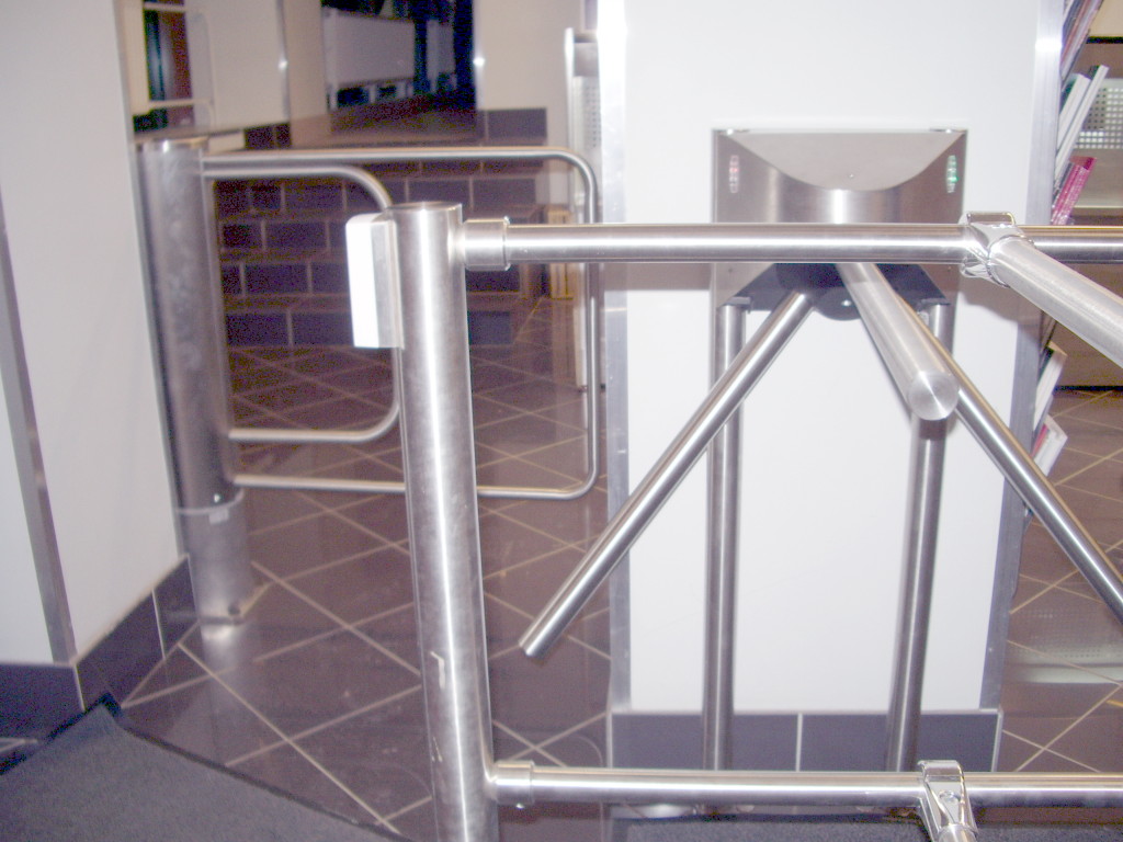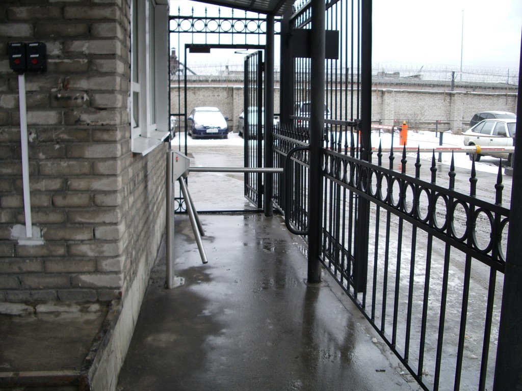 | Ул. Торжковская д. 1. Проходная издательства. Два турникета-трипода, моторная калитка, ограждения. Всё из нержавеющей стали. Фирма ОМА. Компьютерная система СКД. |