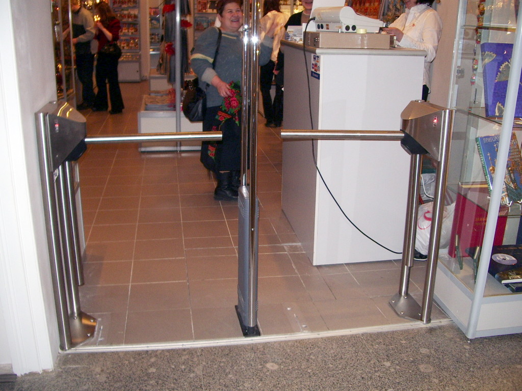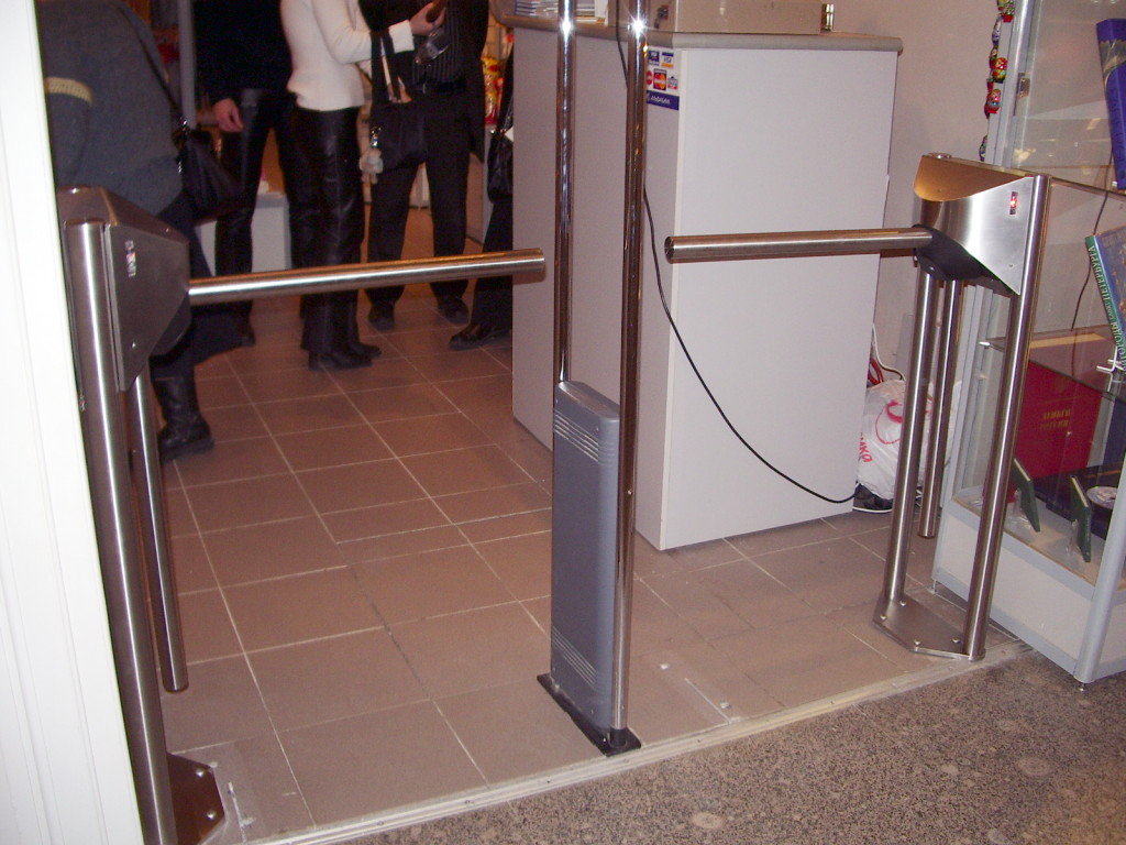 | Царское село. Магазин. Турникеты-твиксеры фирмы ОМА. Нержавеющая сталь. Между твиксерами — рамка антикражевой системы. |