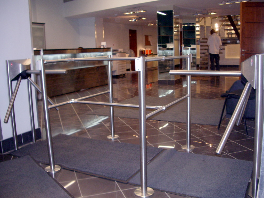 | Севзапмебель, турникеты ОМА 26.566, компьютерная система контроля доступа GATE, вращающийся пожарный барьер "твистер", ограждения. На стене видны бесконтактные считыватели Matrix. Все корпуса и стойки — шлифованная нержавеющая сталь. |