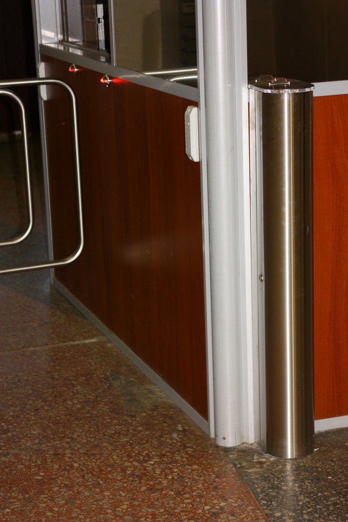 | Фирма "Вита". Турникет ОМА 26.566, неподвижные и поворотные ограждения. Нержавеющая сталь. Система контроля доступа "GATE". На турникете виден считыватель бесконтактных карт. |