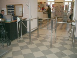 Ул. Торжковская д. 1. Проходная издательства. Два турникета-трипода, моторная калитка, ограждения. Всё из нержавеющей стали. Фирма ОМА. Компьютерная система СКД.