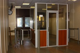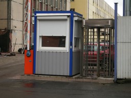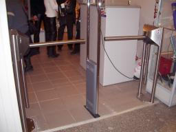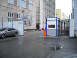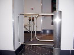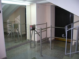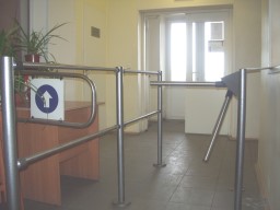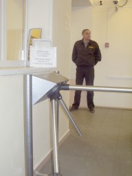 Завод "ТЭМП". Общий вид электронной проходной. На снимке видны два роторных поясных турникета фирмы "ОМА", обычные считыватели пропусков для персонала на стене кабины и глотающий считыватель гостевых карт ("Гоблин"). Гость не может выйти через проходную, не сдав карту, так как обычные считыватели на гостевую карту не реагируют, а "Гоблин" разрешает выход, но при этом проглатывает карту. Роторные турникеты гораздо комфортнее обычных триподов при массовом проходе людей, но при этом заметно дороже и требуют больше места в проходной.
