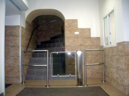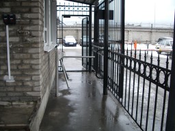 Ул. Ломоносова. Проходная фирмы "Невская оптика". Электромоторная калитка фирмы ОМА. Нержавеющая сталь, закалённое тонированное стекло.