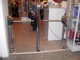 Царское село. Магазин. Турникеты-твиксеры фирмы ОМА. Нержавеющая сталь. Между твиксерами — рамка антикражевой системы.